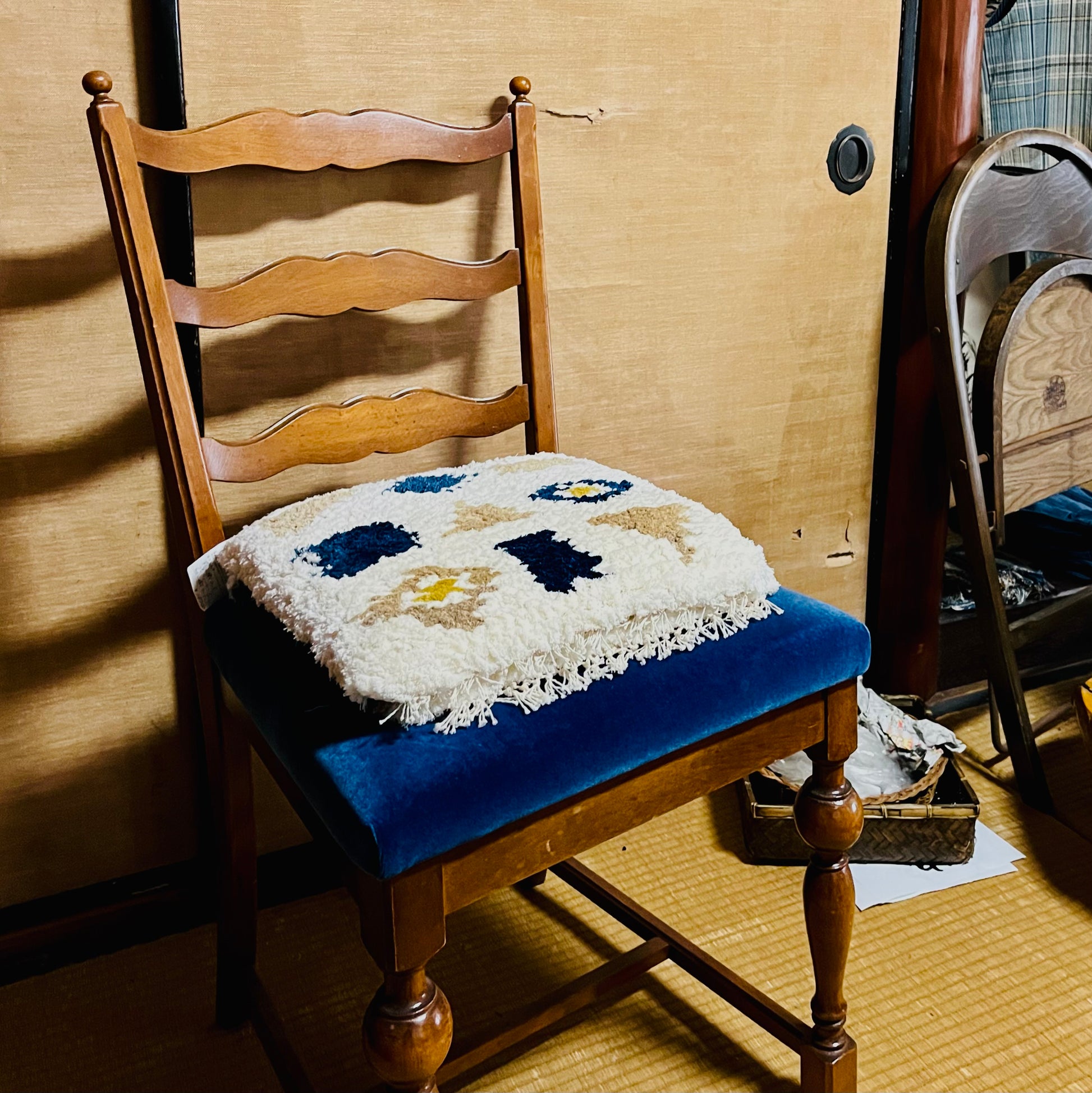 This knotted weaving (notting) mat is made by Orimonya, a non-profit organization with a workshop in Yonago, Tottori Prefecture. The navy and light blue (asagi, a pale blue tone) areas are woven with indigo-dyed yarn, while the brown tones are woven with plant-dyed yarn.