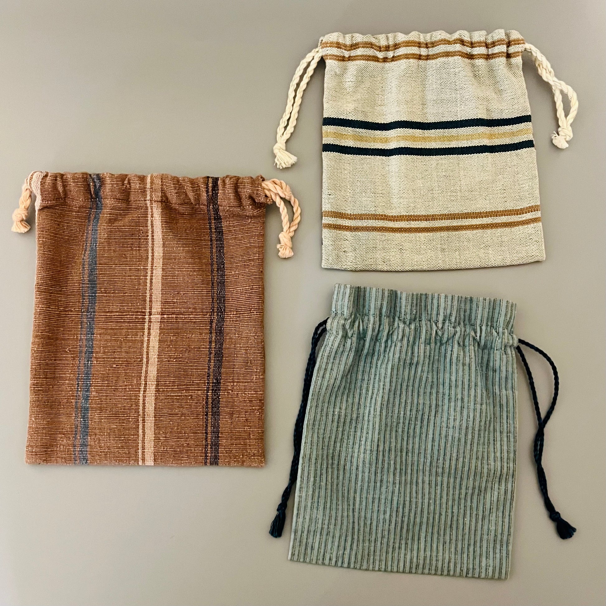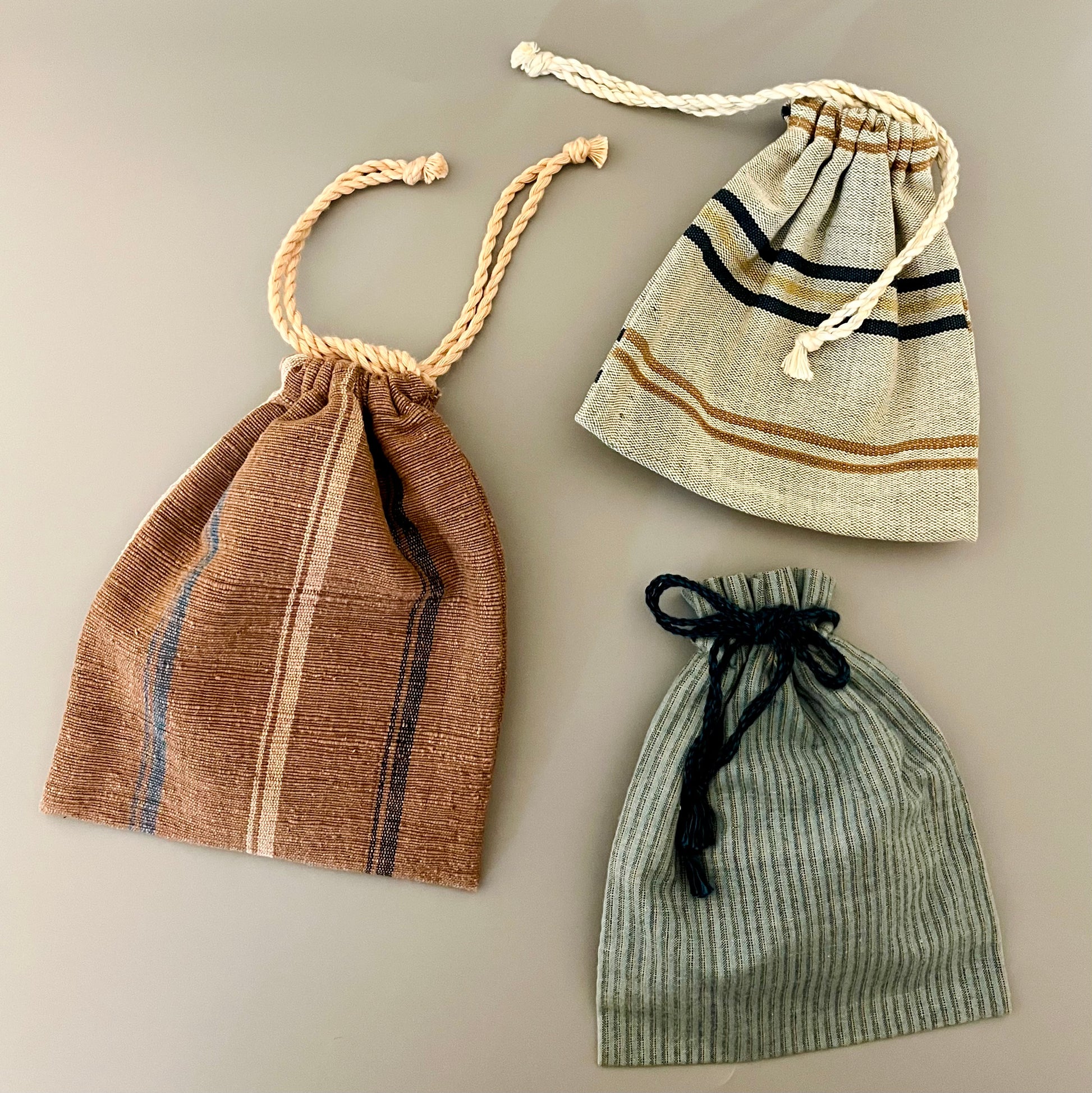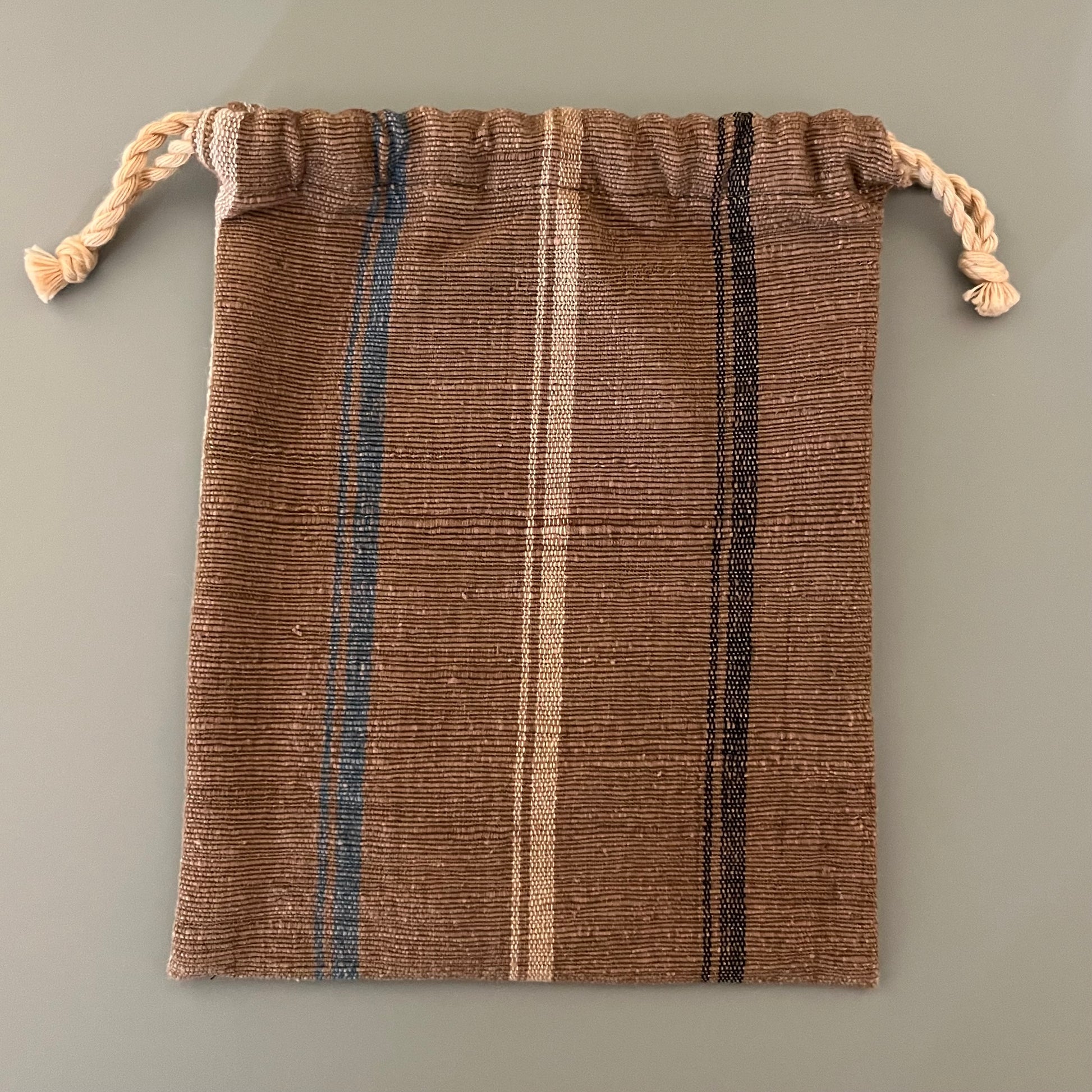鳥取県米子市に工房を構える NPO 法人「おりもんや」の小さな巾着です。藍染めや草木染めの糸で手織りした布を用いて、素朴なストライプ柄に仕立てられています。茶色の巾着には、伯州綿を手紡ぎした糸で織った布を使用しており、糸の太さに手紡ぎならではの表情が感じられます。