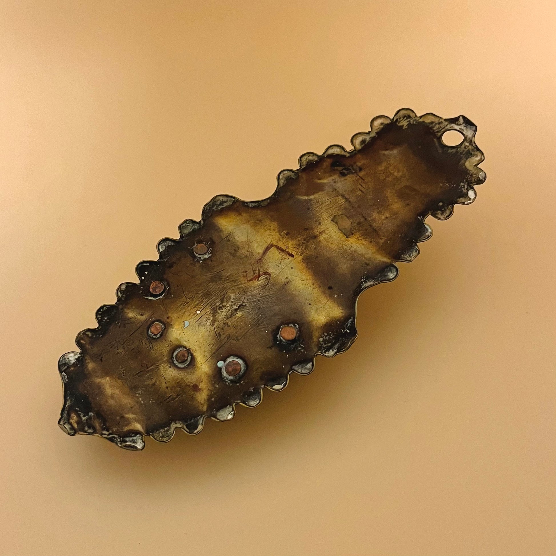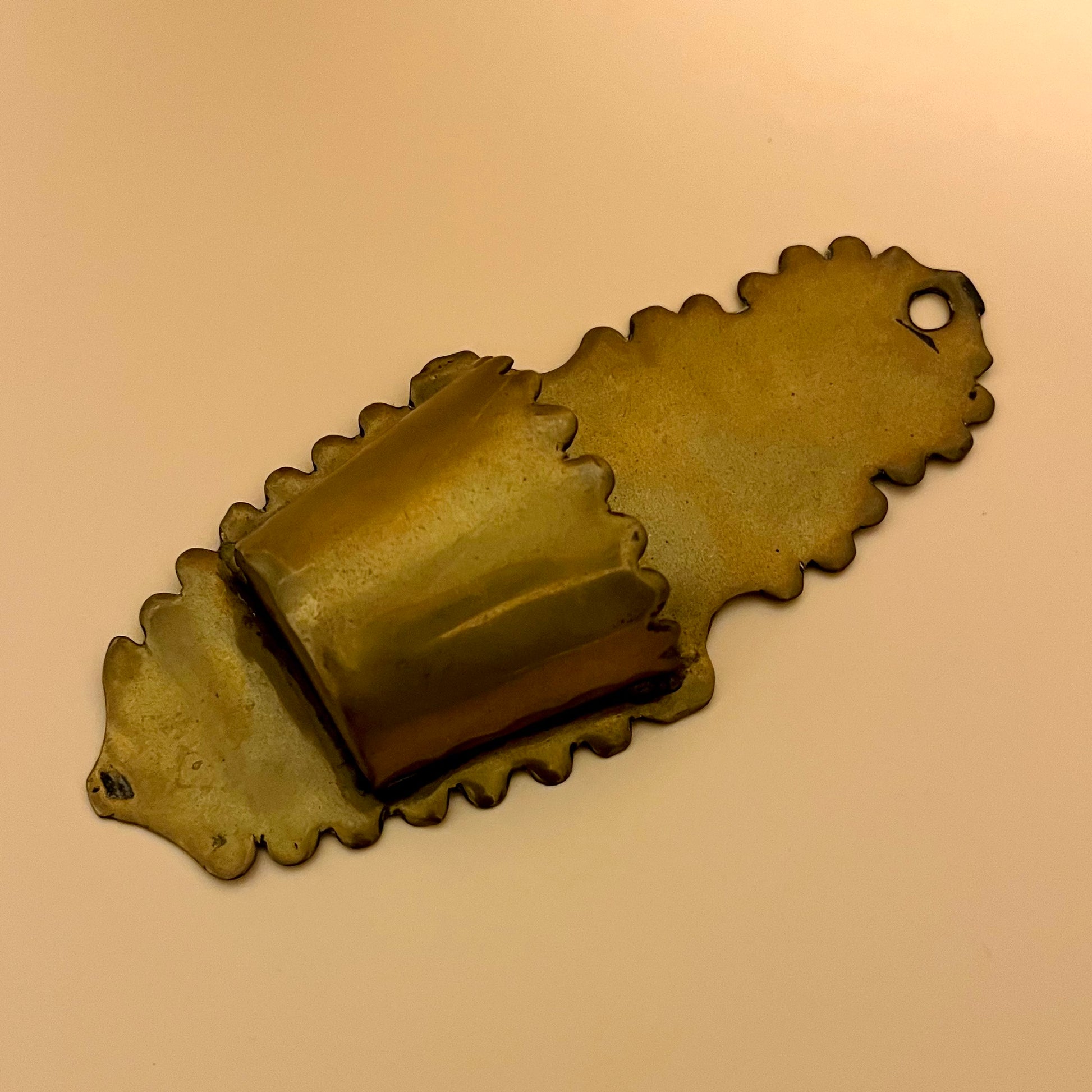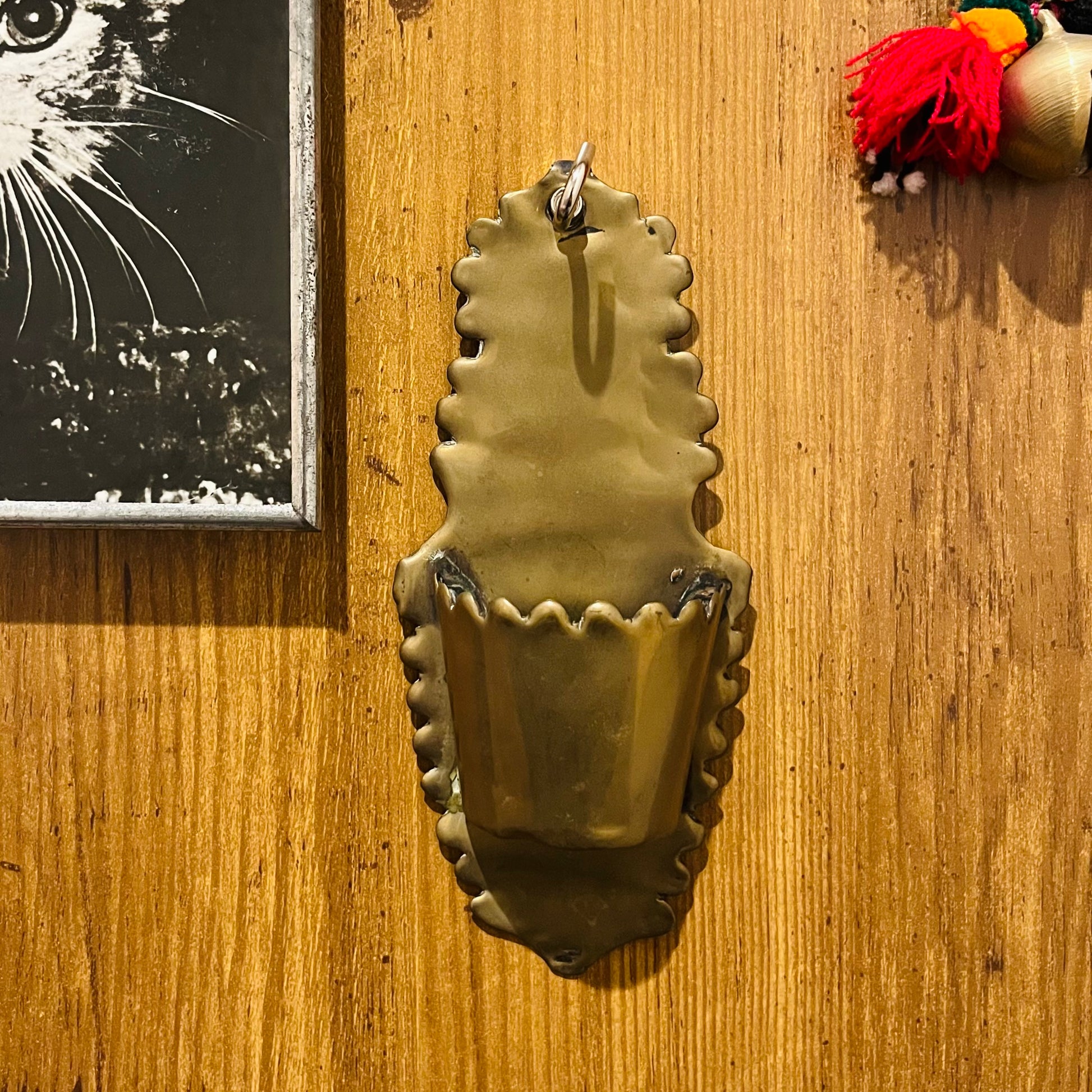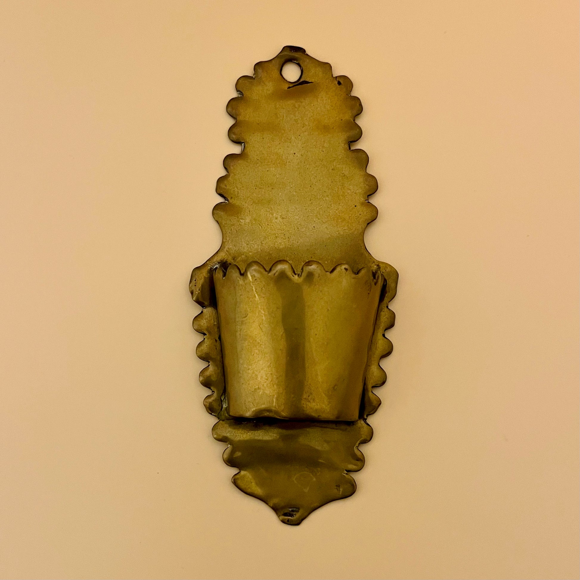 ドイツ・ミュンヘン近郊の金属職人により作られた、ヴィンテージの真鍮製聖水盤(壁掛け)です。背面プレートの縁はスカラップ状に成形され、聖水を入れるための小さなカップが付いています。上部の穴により壁に掛けて使用できます。真鍮ならではの落ち着いた風合いがあります。
