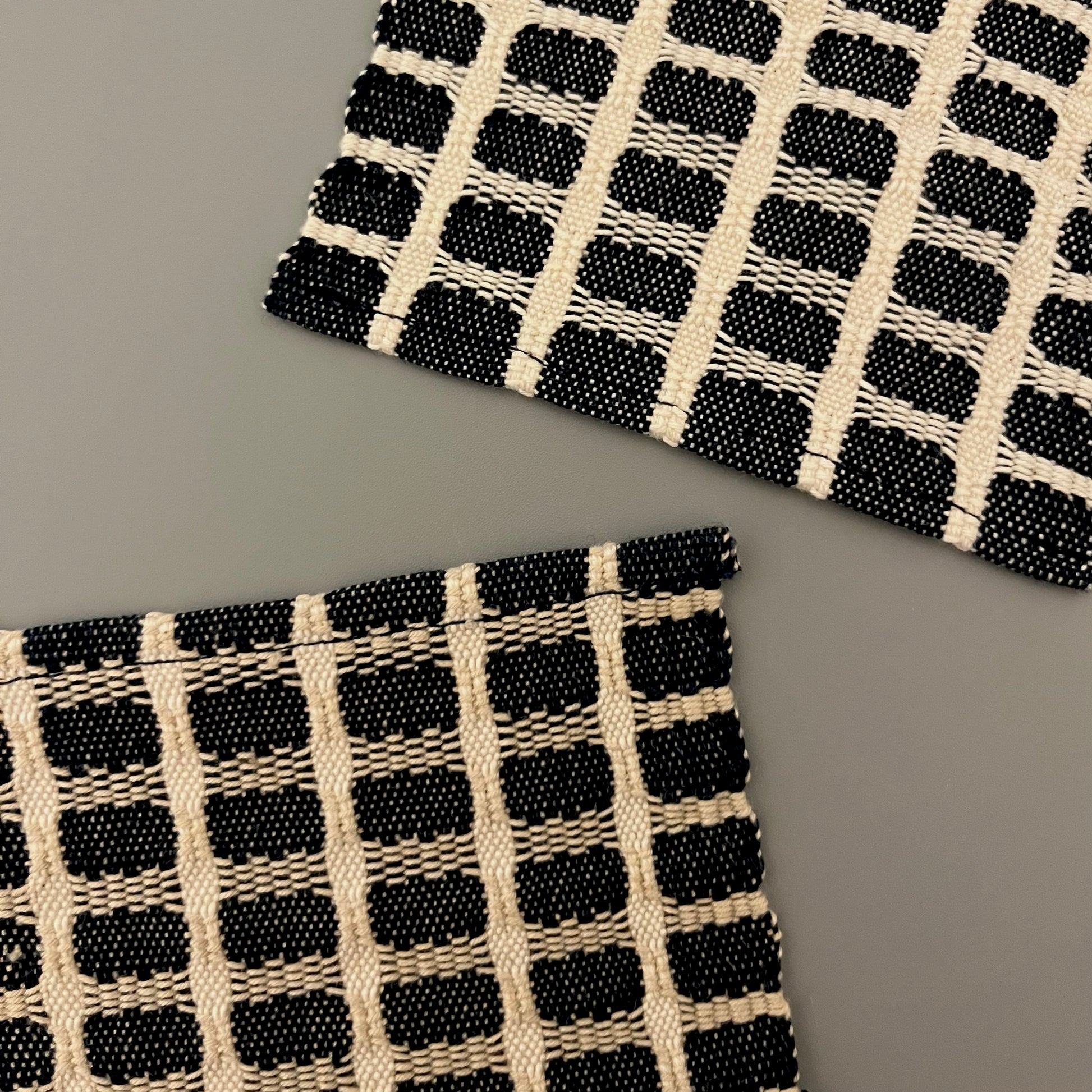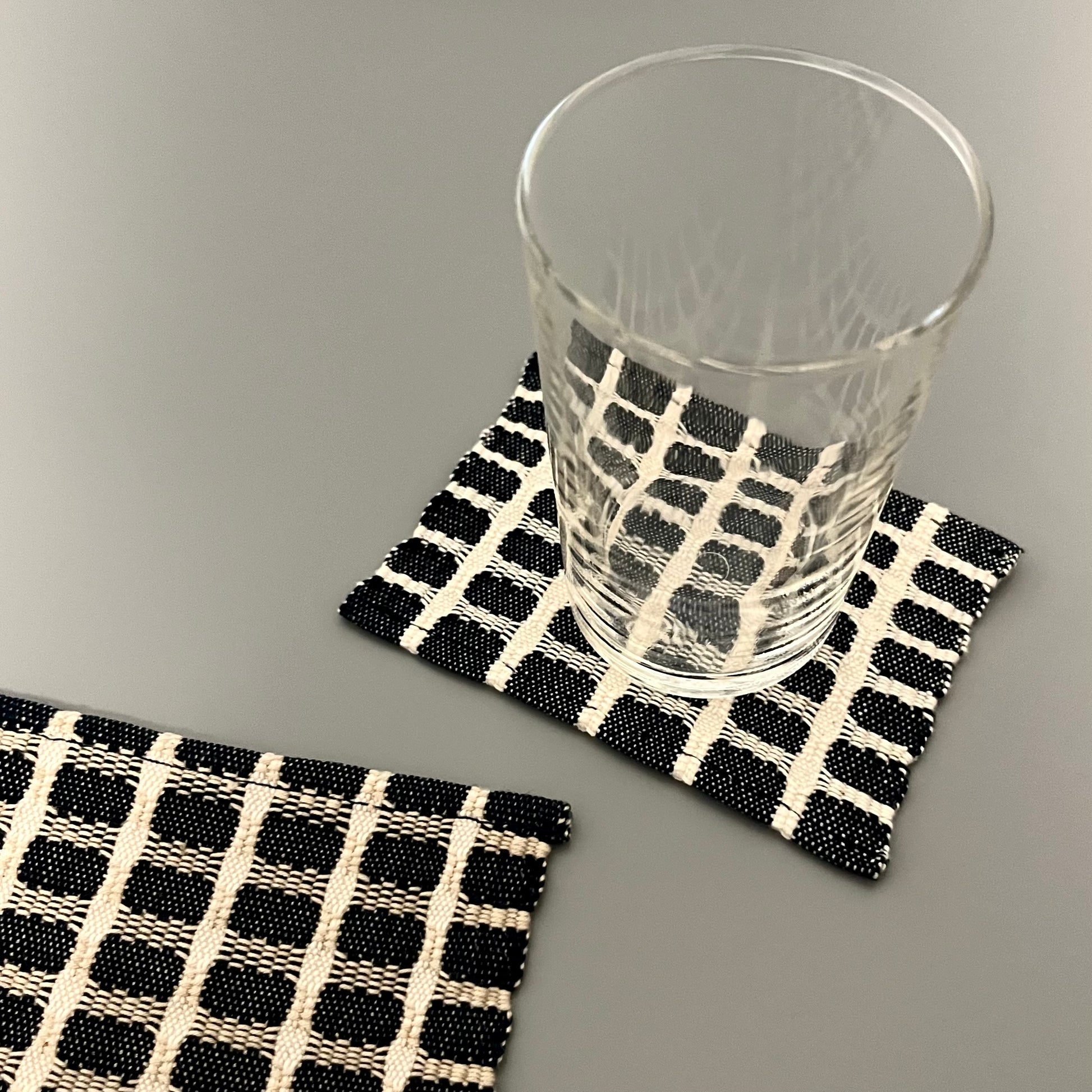 藍染めの糸で織った地に、草木染めの茶色みがかった糸を合わせたものと、染めを施していない生成りの糸を合わせたものの2種類のコースターです。並べて置くと、藍の深い色合いの中に、草木染めと生成りの違いが際立ちます。少し小さめの、細長いかたちをしていて、ビールグラスなど細めのグラスにちょうどよいサイズ感です。